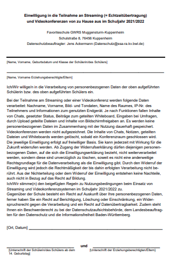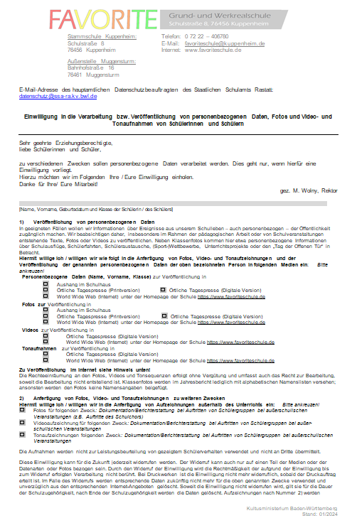 Formulare Wir stellen Ihnen gerne folgende Formulare zur Verfügung: Allgemein: Merk- und Informationsblatt zur Entschuldigungspflicht Vordruck Entschuldigung Datenschutz und Videokonferenzen Antrag auf Beurlaubung Einwilligung DSGVO Veröffentlichung personenbezogener Daten Anmeldung: Schulaufnahmebogen GS Schulaufnahmebogen WRS Schulbetreuung/GTS: Anmeldung GTS Anmeldung Schulbetreuung Benutzerordnung Schulbetreuung Entgeltordnung für Schulbetreuung Schülerpraktika: Rückmeldebogen Praktikumsbetriebe Informationsbrief Praktika